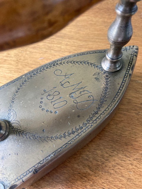 I love the inscribed date on this iron — one offshoot of my obsession with history is my belief that every physical object should have its date of creation put somewhere on it, for the benefit of those who discover it in the future. Of course, this doesn’t always happen, so the carving on the iron makes me happy its creator had similar thoughts. It’s a safe bet that one round with this household tool would also make any of us grateful for the modern miracle of wrinkle-resistant fabric.